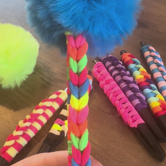 Each pen features a soft fuzzy pom-pom topper and a colorful braided grip, making writing extra fun for kids and kids-at-heart.